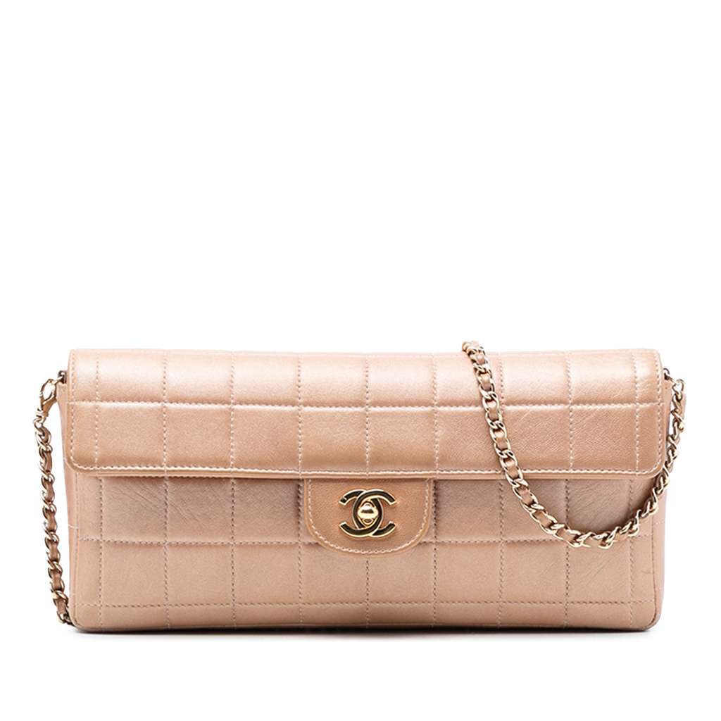 This shoulder bag features a quilted lambskin leather body, a leather woven chain link shoulder strap, a front flap with interlocking Cs with a twist lock closure, and interior slip pockets.
