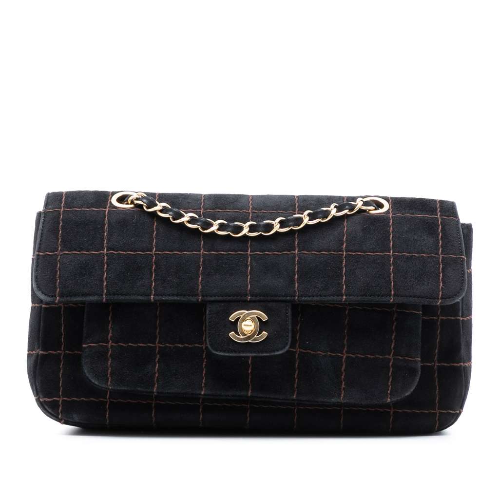 This shoulder bag features a quilted suede leather body, leather woven chain straps, a front flap with twist lock closure, an exterior back slip pocket, and interior zip and slip pockets.