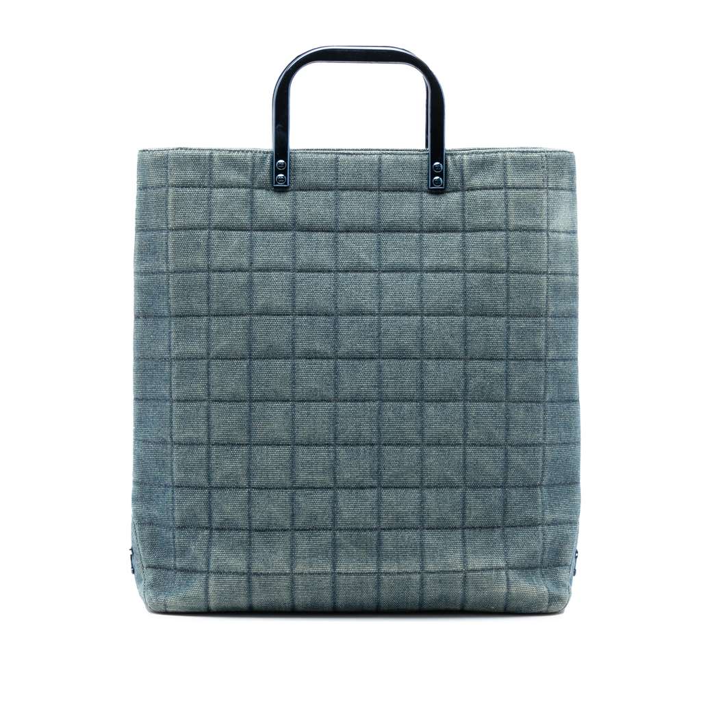 This tote bag features a quilted denim body, flat plastic handles, an open top, and an interior zip pocket.