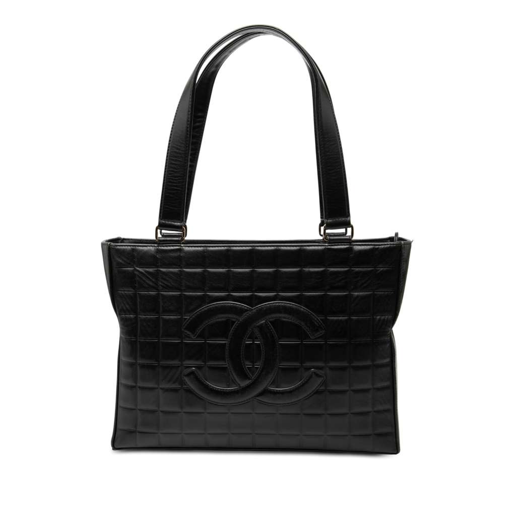 This tote bag features a quilted lambskin leather body, flat leather shoulder straps, a top zip closure, and an interior zip pocket.