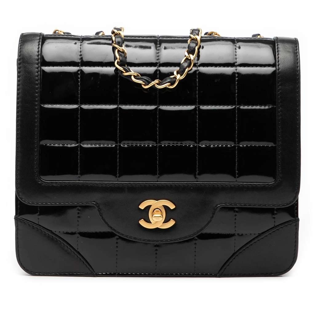 This shoulder bag features a patent and lambskin leather body, leather woven chain link shoulder strap, front flap with turn lock closure, an exterior back slip pocket, and interior zip and slip pockets.
