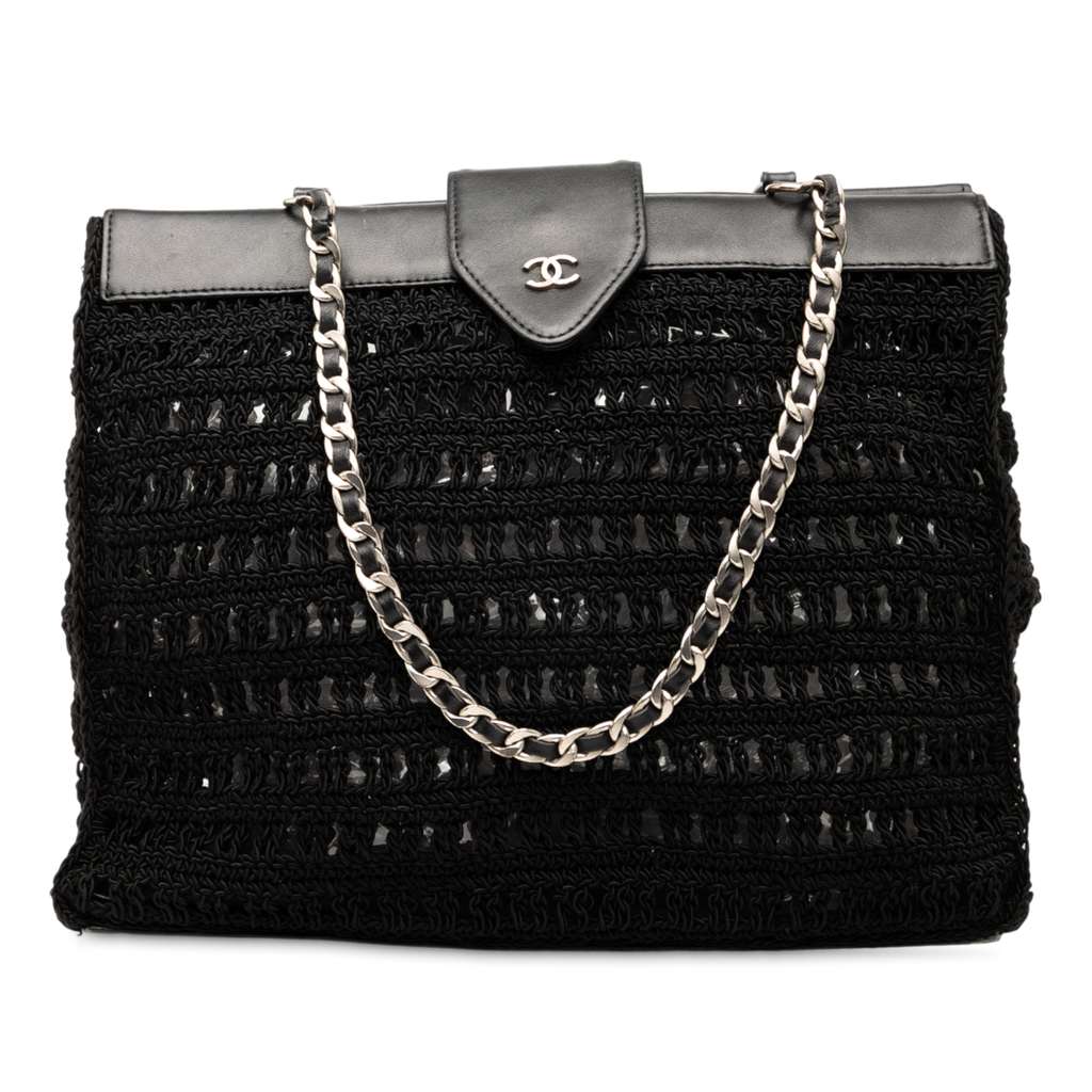 This tote bag features a raffia and leather body, leather woven chain straps, a leather top strap with magnetic snap closure, and interior zip and slip pockets.