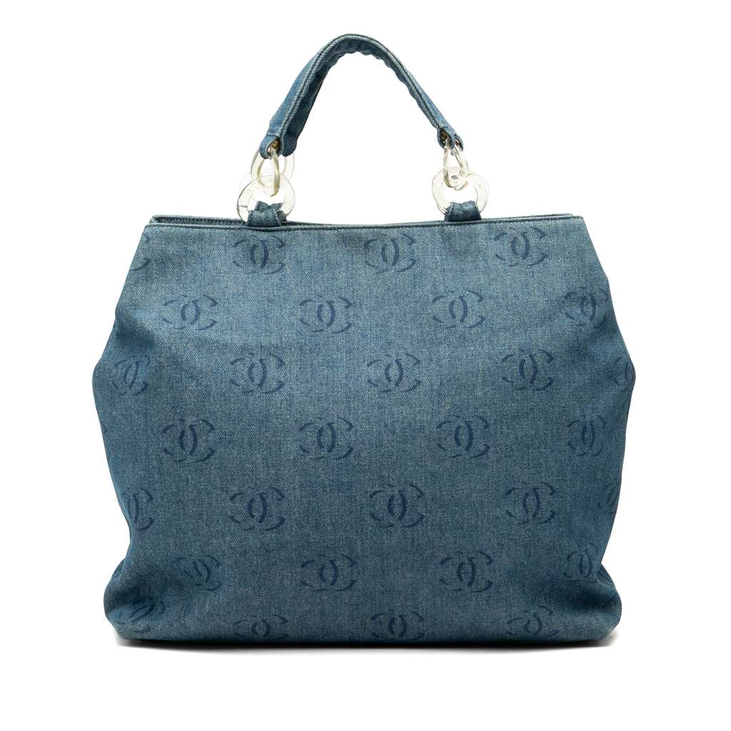 This CC denim tote features a denim body, flat denim handles, an open top with magnetic snap closure, and an interior zip closure.
