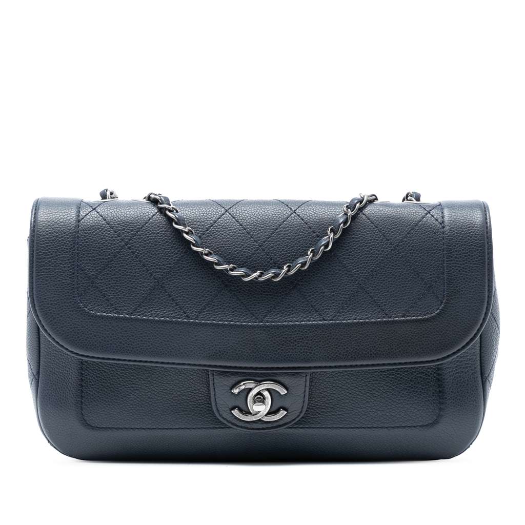 This flap bag features a quilted caviar leather body, leather woven chain strap, a front flap with twist lock closure, and interior zip and slip pockets.