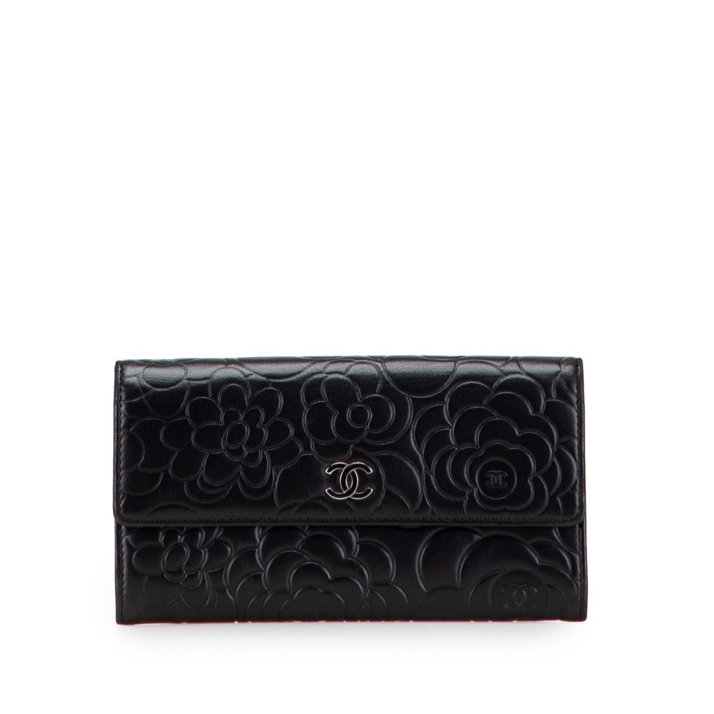 This wallet features an embossed leather body, a front flap with snap button closure, an interior zip compartment, and interior slip pockets.