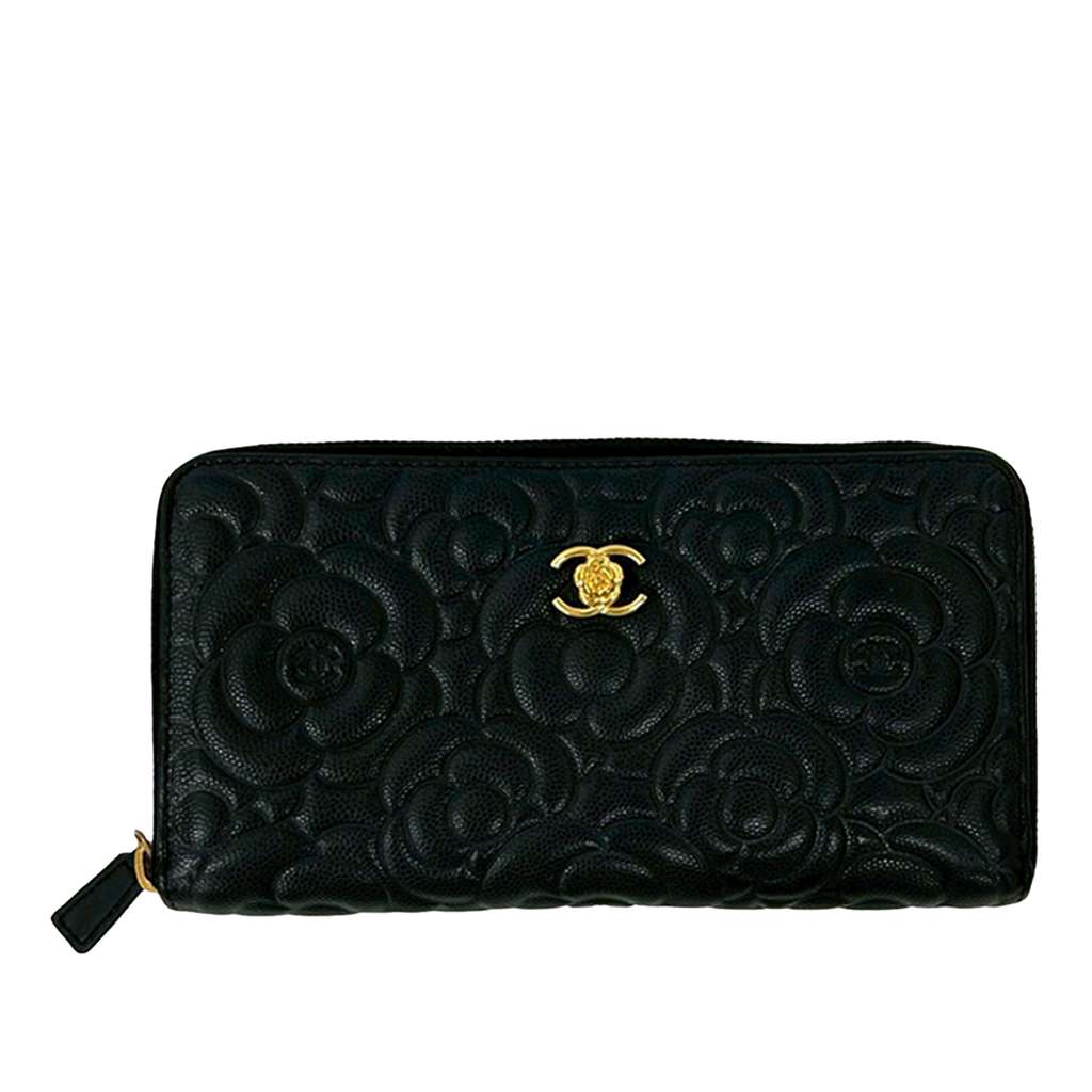 This wallet features an embossed caviar leather body, a zip around closure, and interior zip and slip pockets.