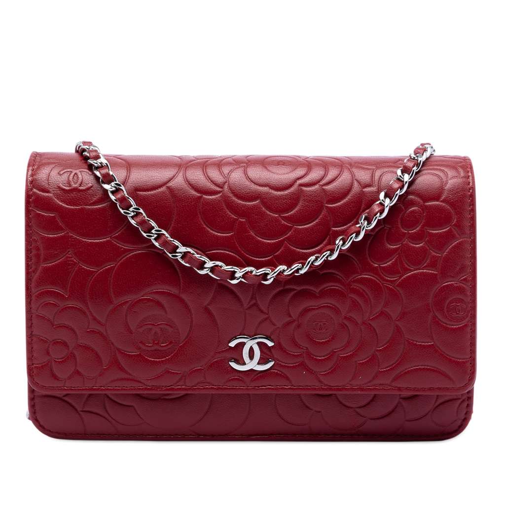 Chanel CC Embossed Lambskin Camellia Wallet On Chain Red Min