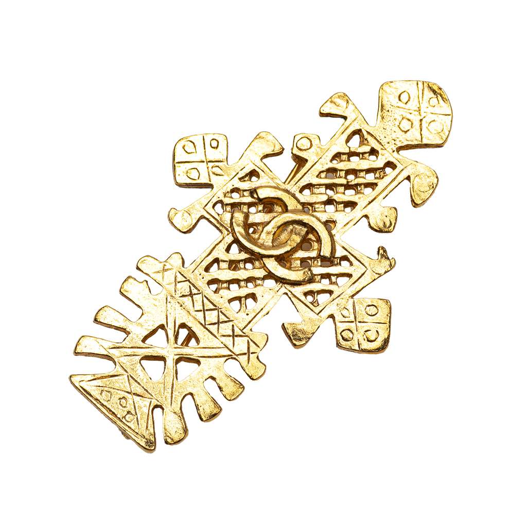 This brooch features a gold plated metal body and a back pin closure.