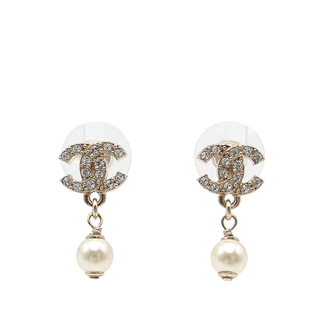 These earrings features a gold plated metal body with rhinestones details, faux pearls charms, and bullet back closures.