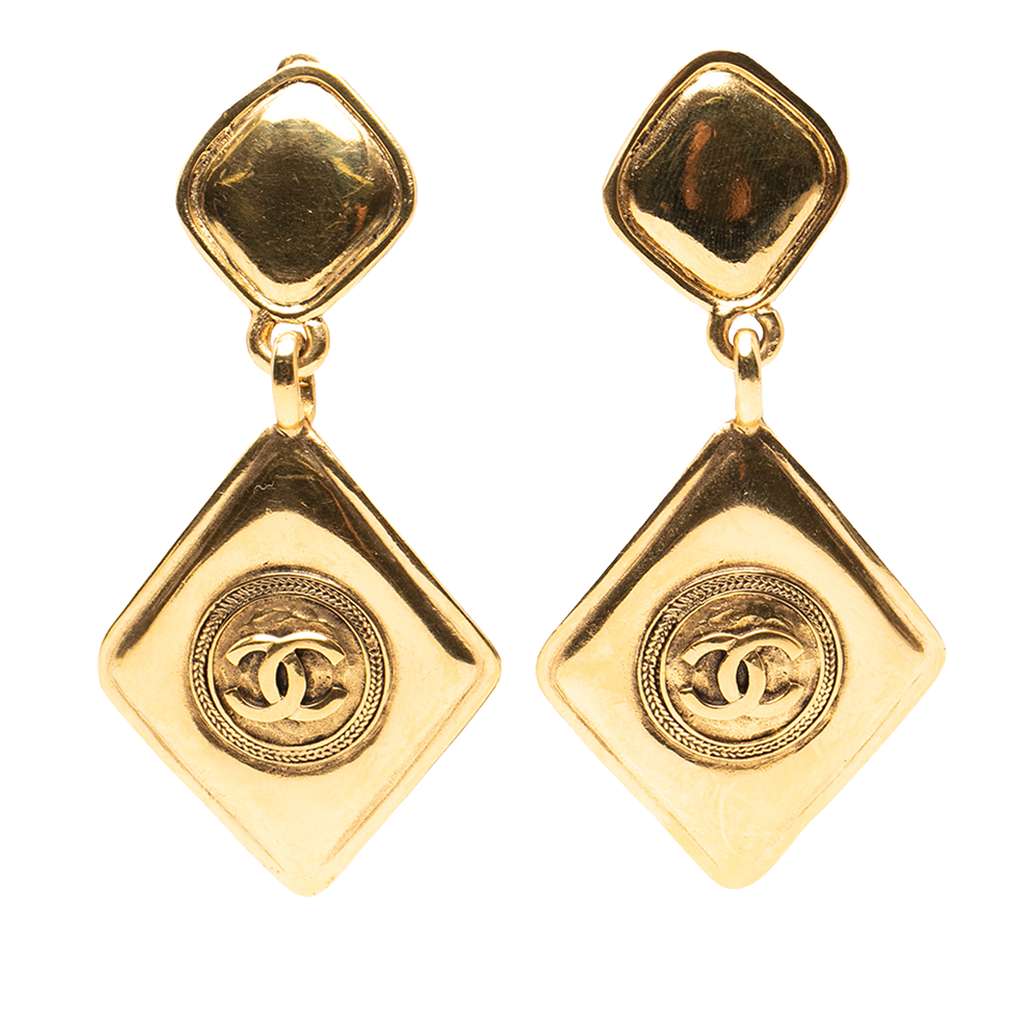 Chanel CC Gold Plated Diamond Drop Clip On Earrings Gold Met