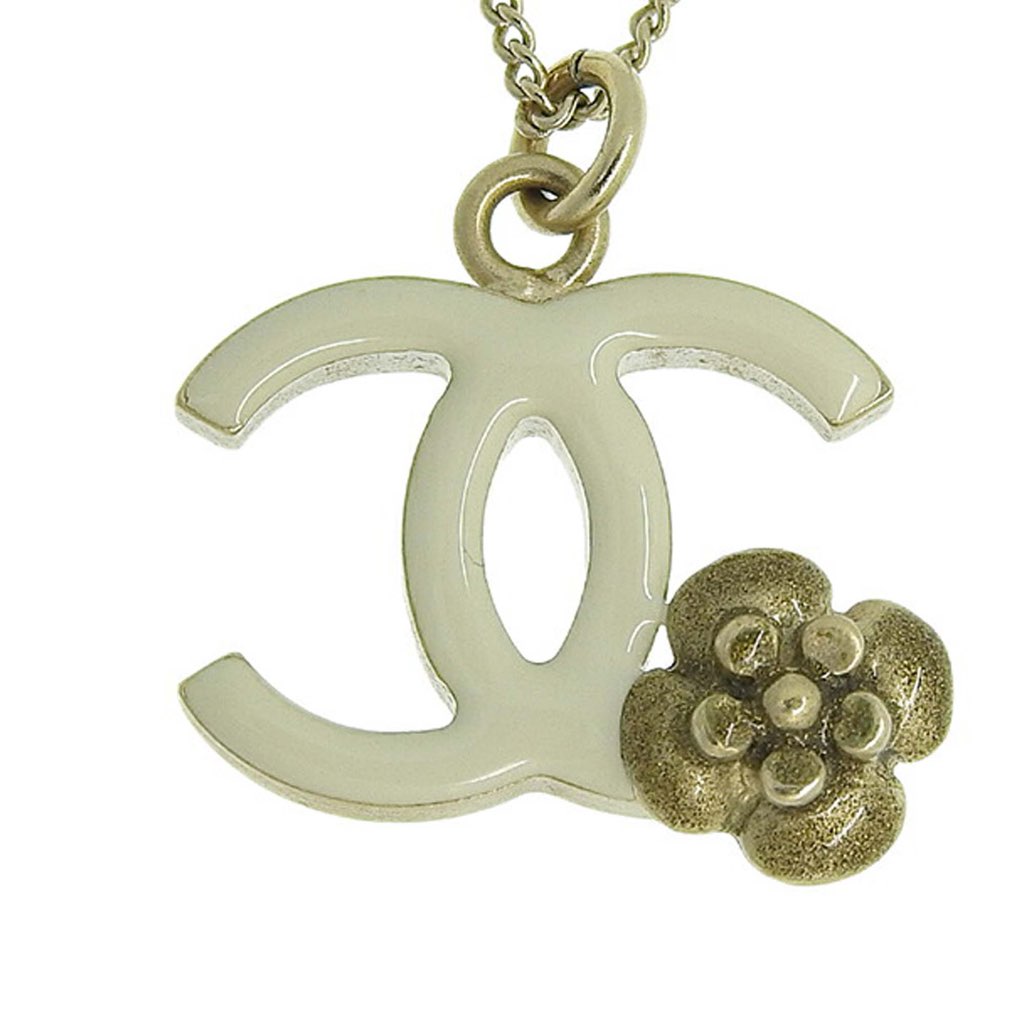 This necklace features a gold plated chain, an enamel CC logo with camellia charm, and a lobster clasp closure.