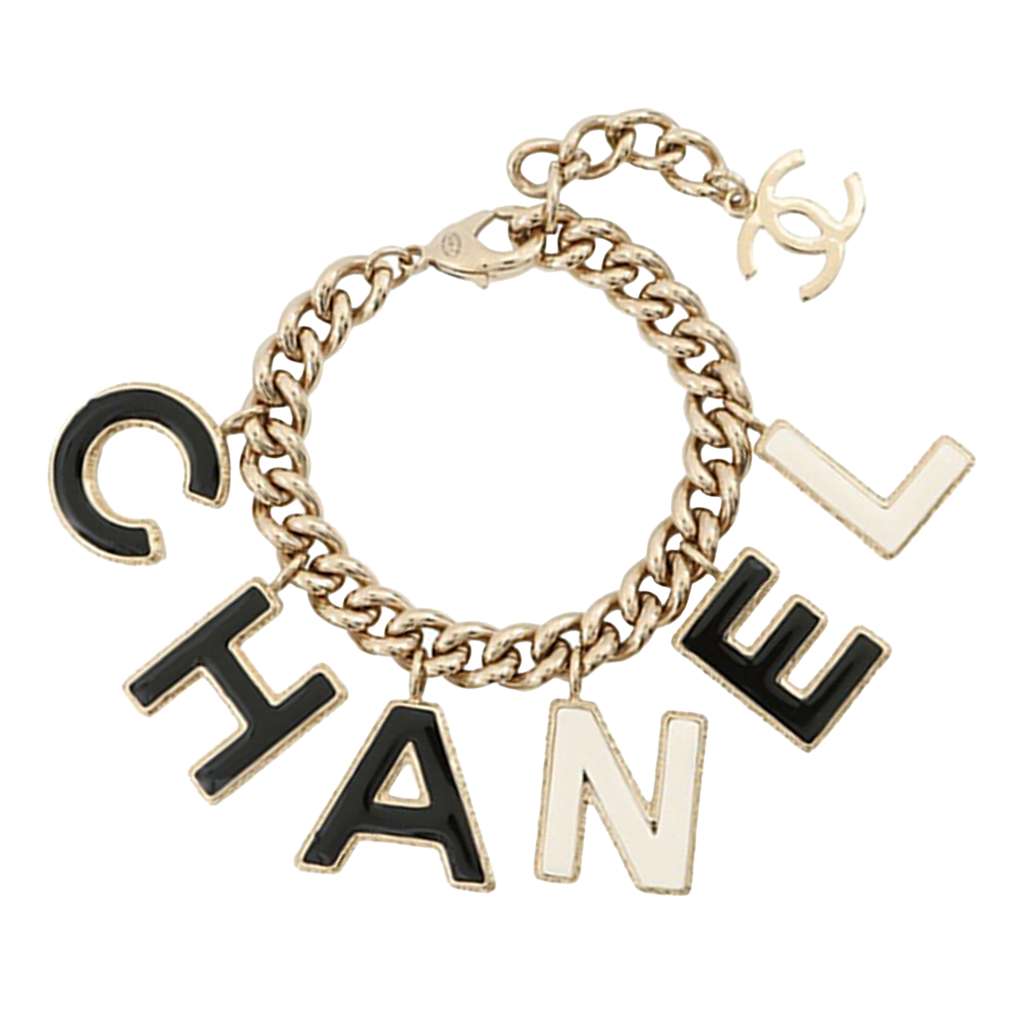 This bracelet features a gold-plated metal body, logo charms with enamel details, and a lobster clasp closure.
