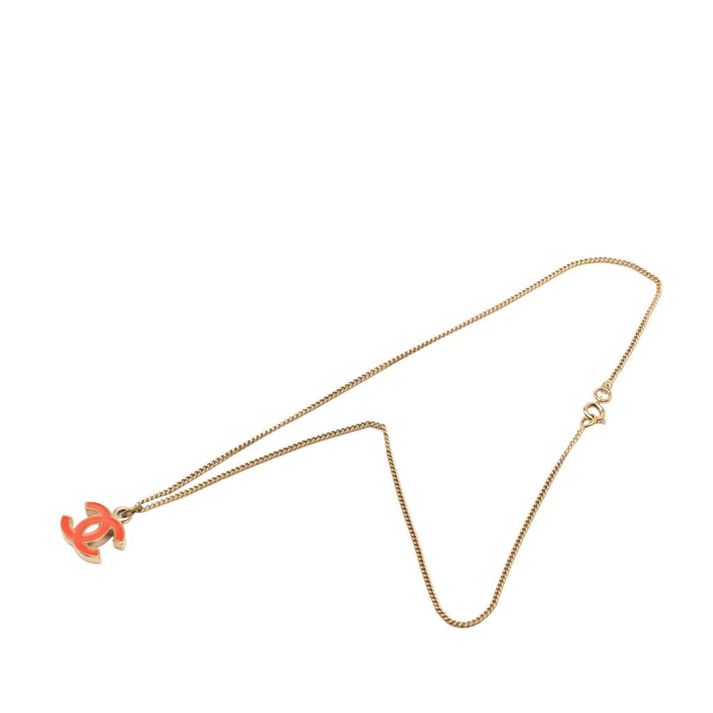This necklace features a gold-tone chain, a CC pendant with enamel, and a spring ring closure.