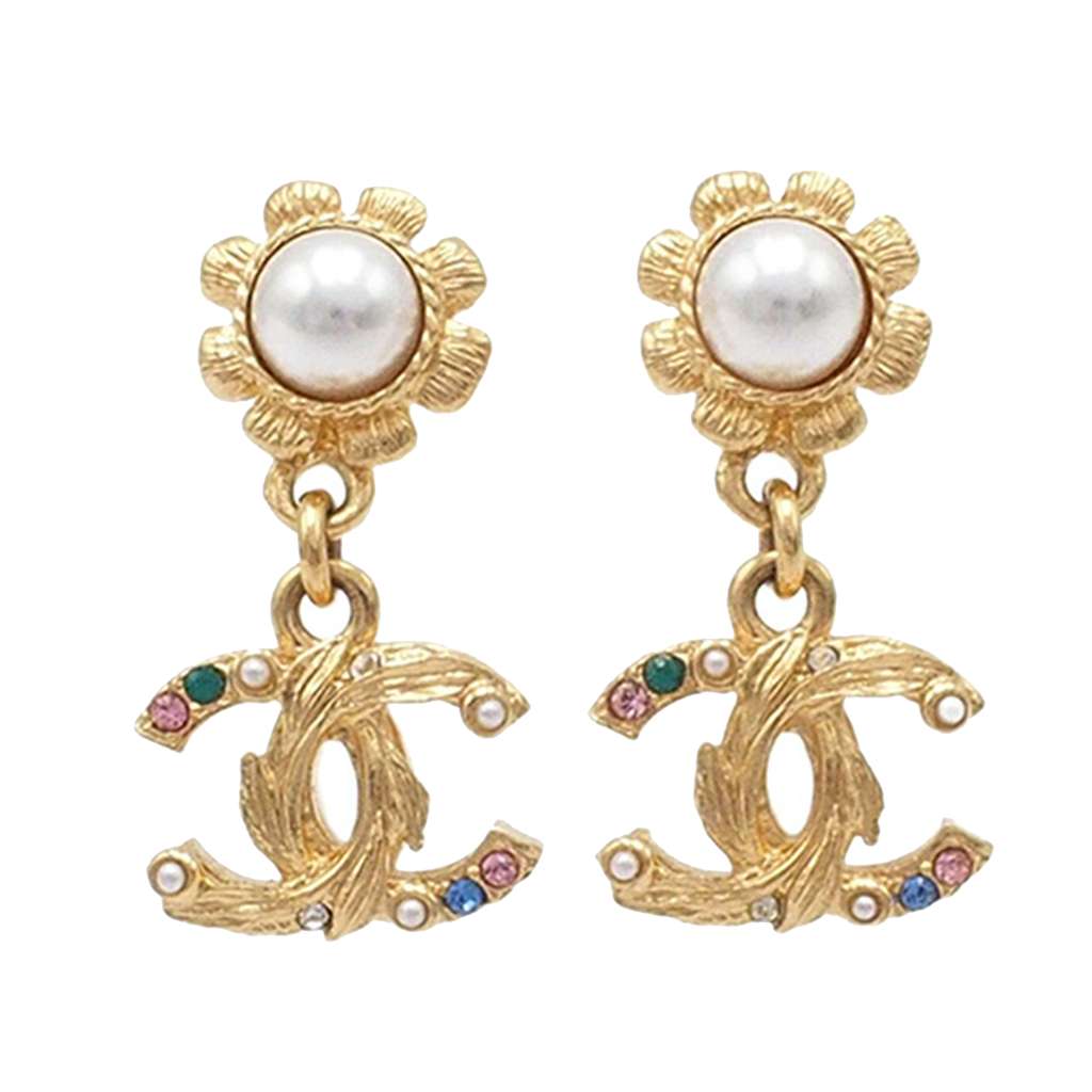 These earrings features a gold plated metal and faux pearl body, CC charms with rhinestone details, and push back closures.