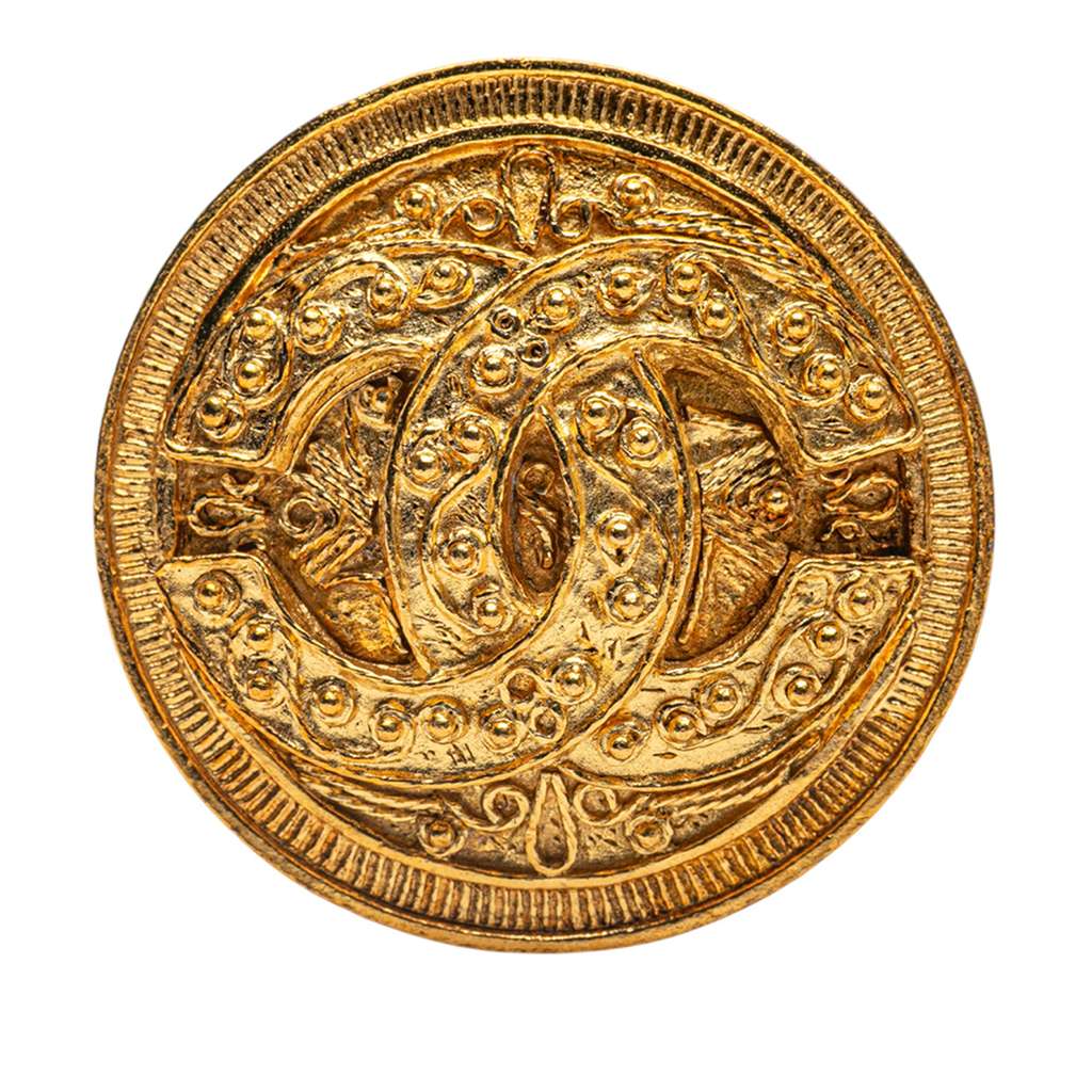 This brooch features a gold-plated metal body and a back pin closure.