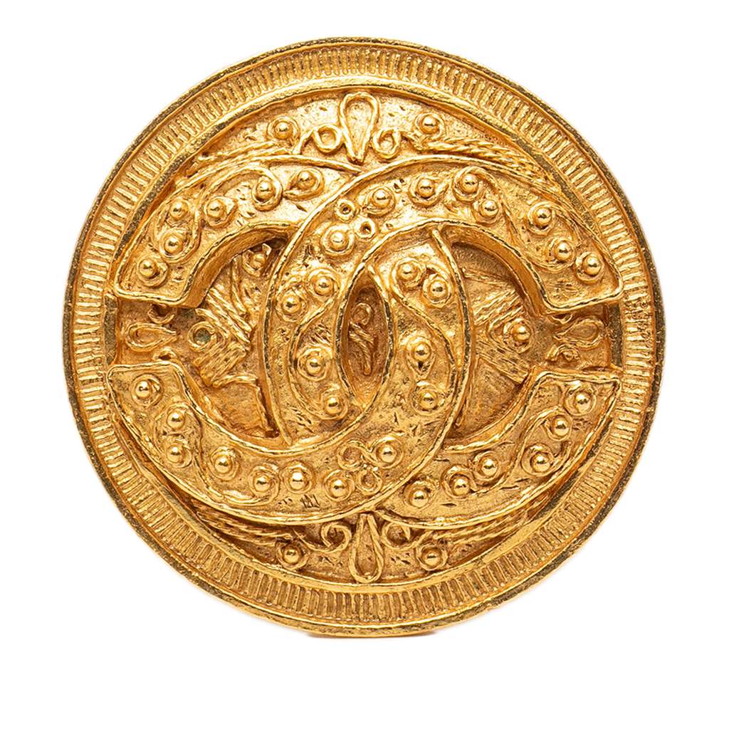 This brooch features a gold-plated metal body and back pin closure.