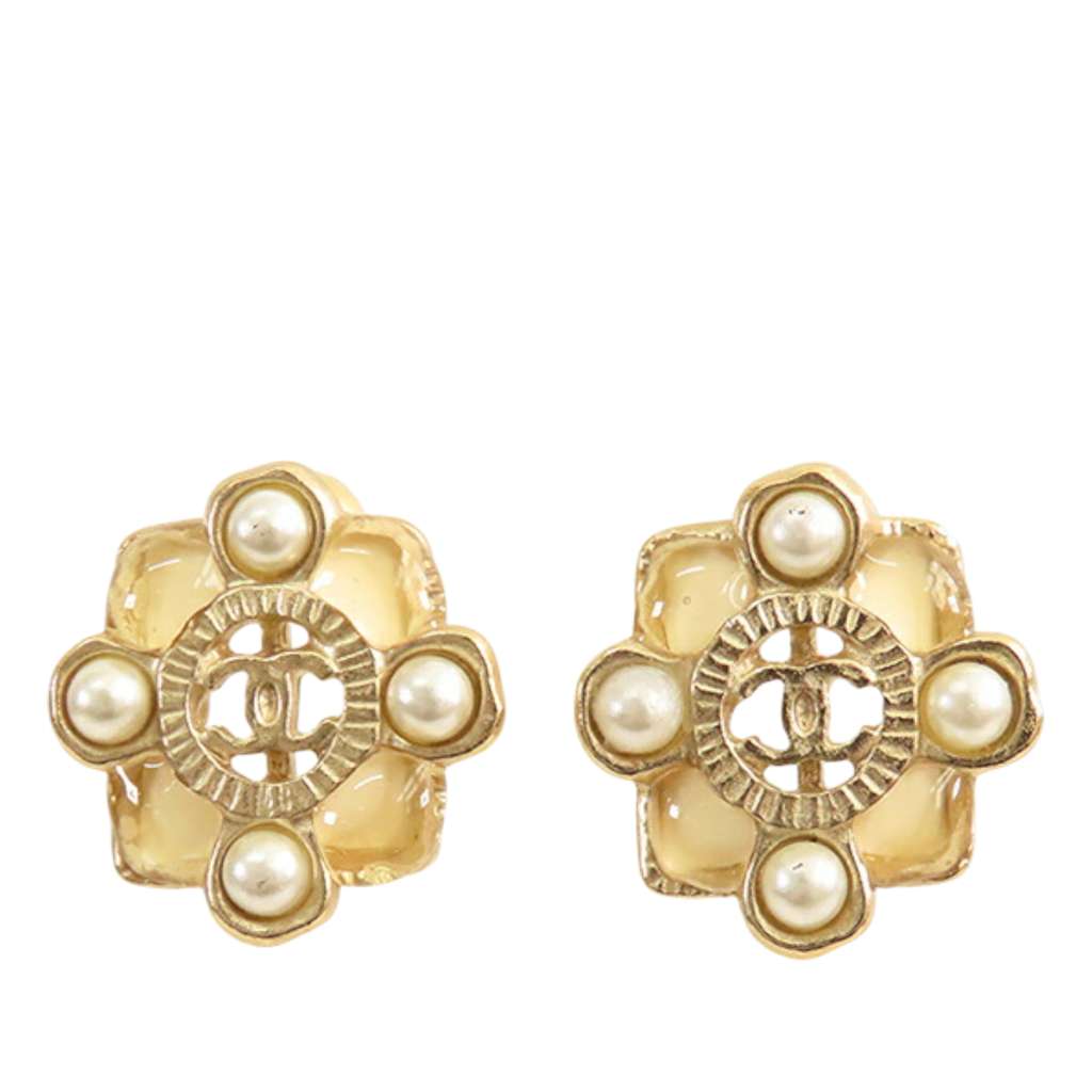 These earrings feature gold plated metal bodies, faux pearls and resin embellishments, and push back closures.