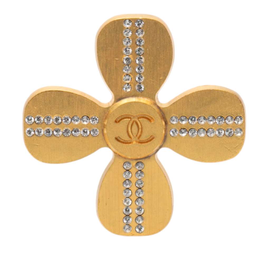 This brooch features a gold plated body with rhinestone details and a back pin closure.
