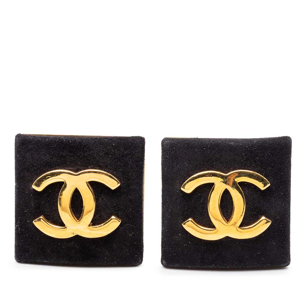 Chanel CC Gold Plated Suede Square Clip On Earrings Black Le