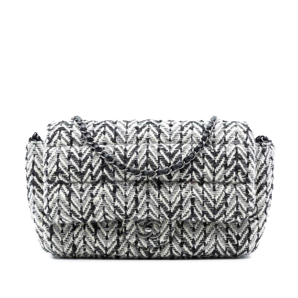 Chanel CC Herringbone Tweed Flap Black Large Tweed