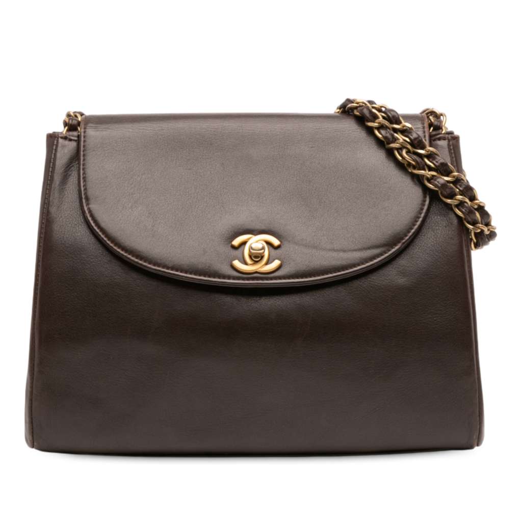 This shoulder bag features a lambskin leather body, gold-tone leather woven chain link shoulder strap, a front flap with interlocking Cs and a twist lock closure, and an interior zip pocket.