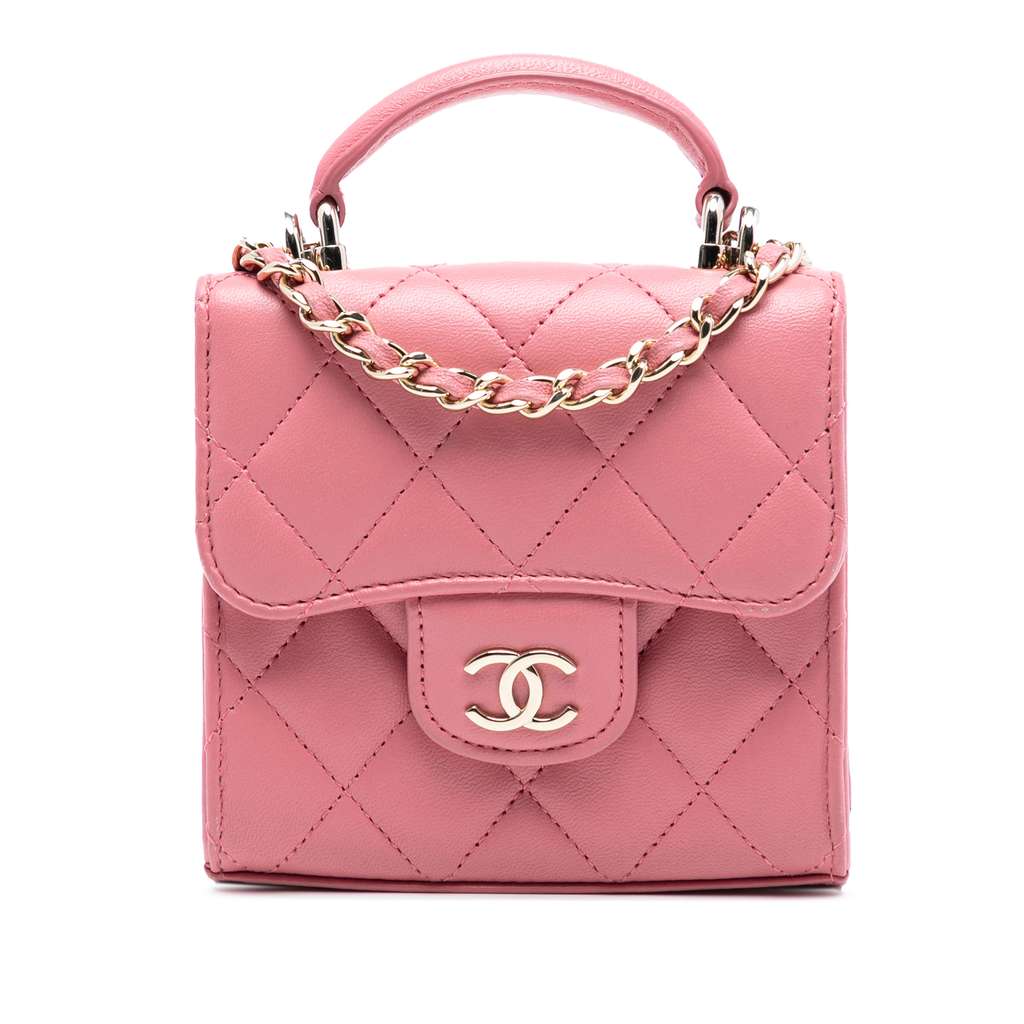 This satchel features a quilted lambskin leather body, a flat leather top handle, a leather-woven chain strap, and a flap with snap button closure.