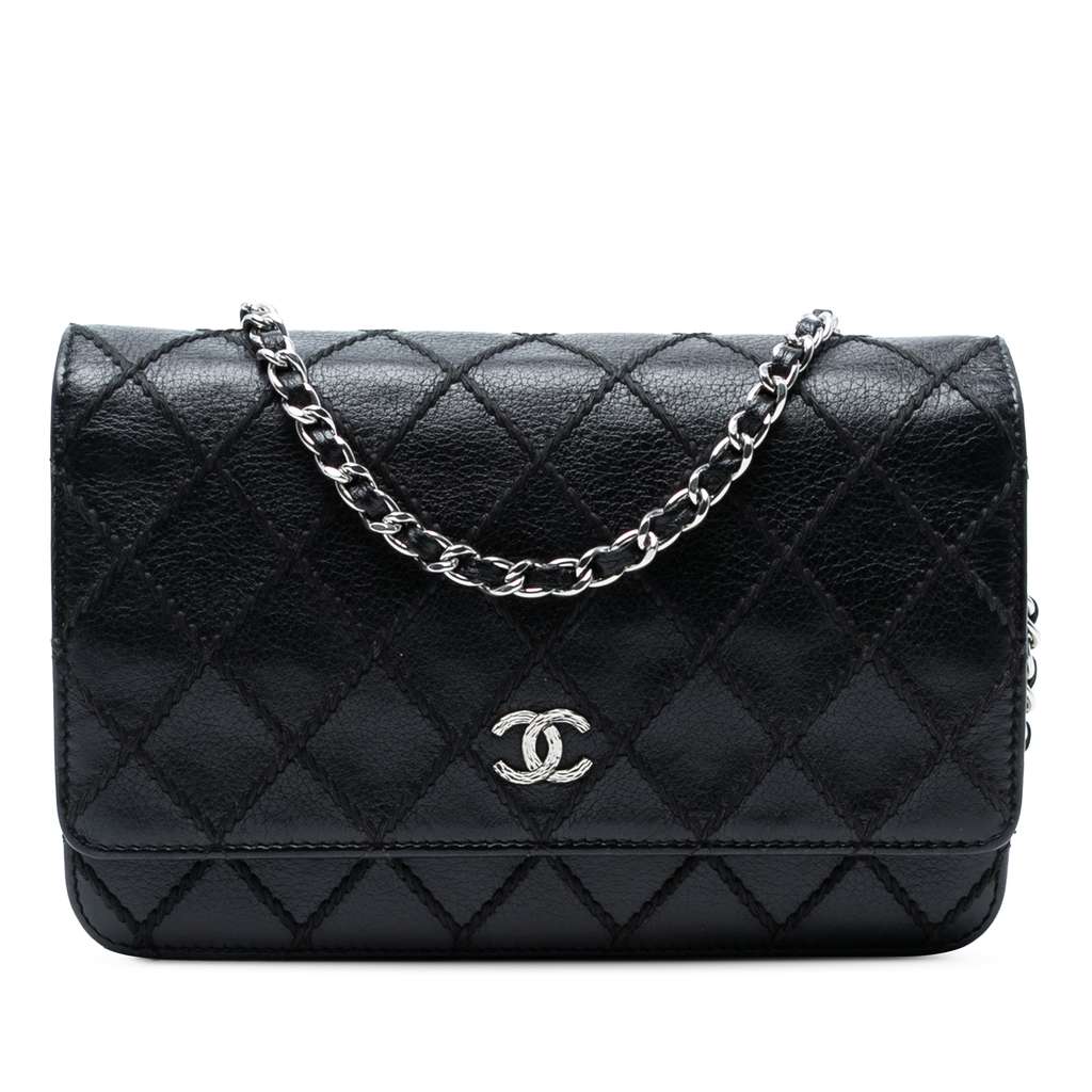 This wallet-on-chain features a lambskin leather body with stitching details, a leather woven chain strap, a front flap with a magnetic closure, and interior zip and slip pockets.