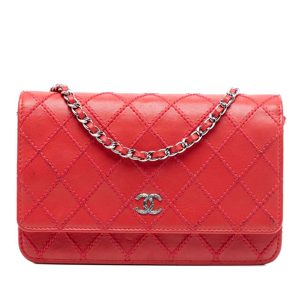 This wallet-on-chain features a lambskin leather body with double stitching details, a leather woven chain-link strap, a front flap with a magnetic closure, and interior zip and slip pockets.