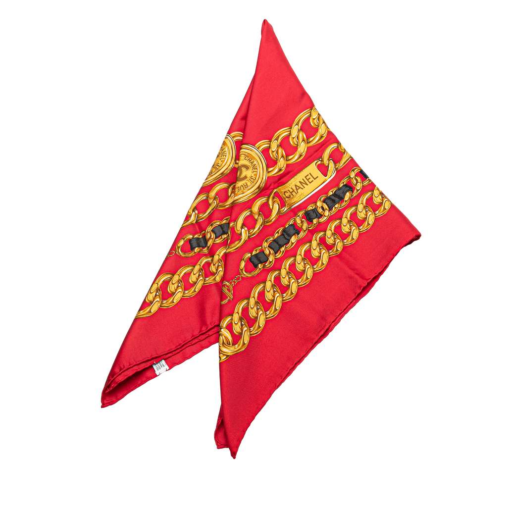 The CC Medallion Chain scarf features a print on 100% silk.