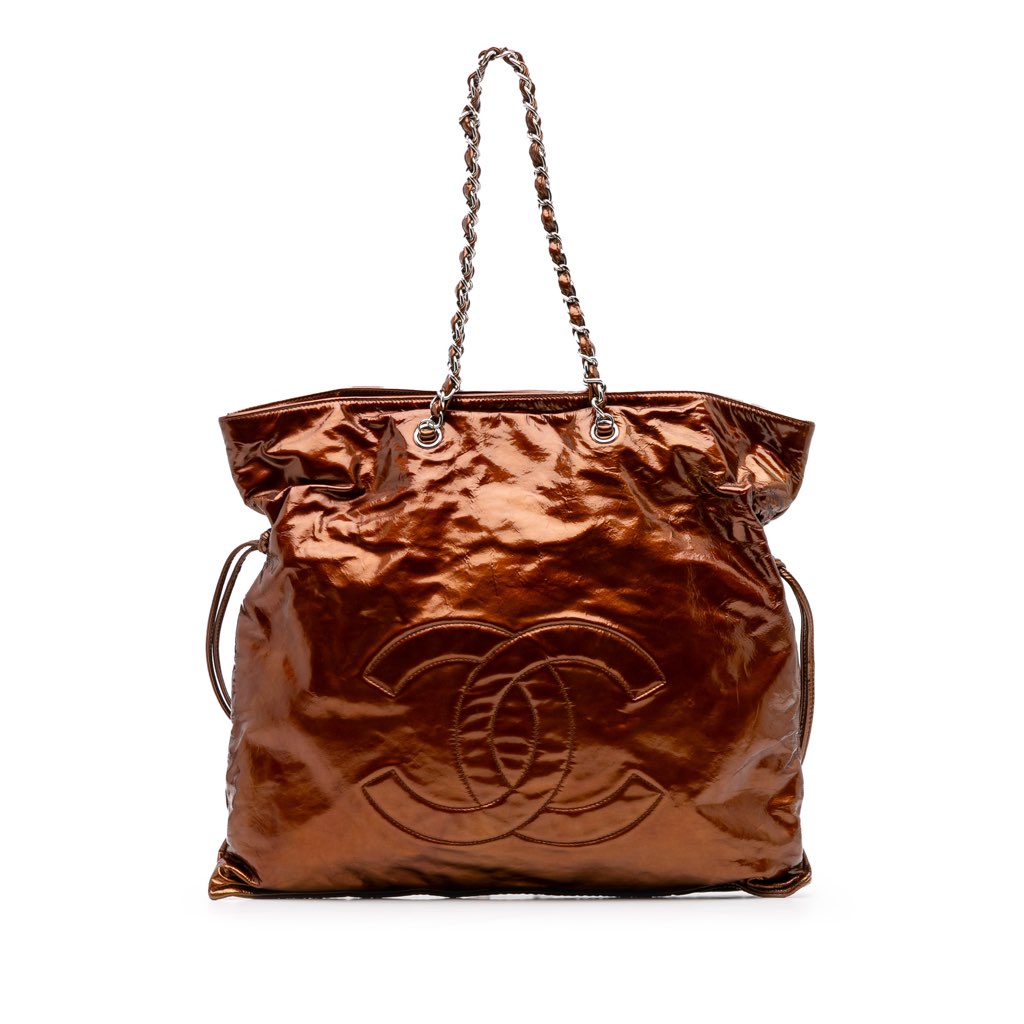 This tote bag features a patent leather body, leather-woven chain link shoulder handles, an open top with magnetic snap closure, and interior zip and slip pockets.