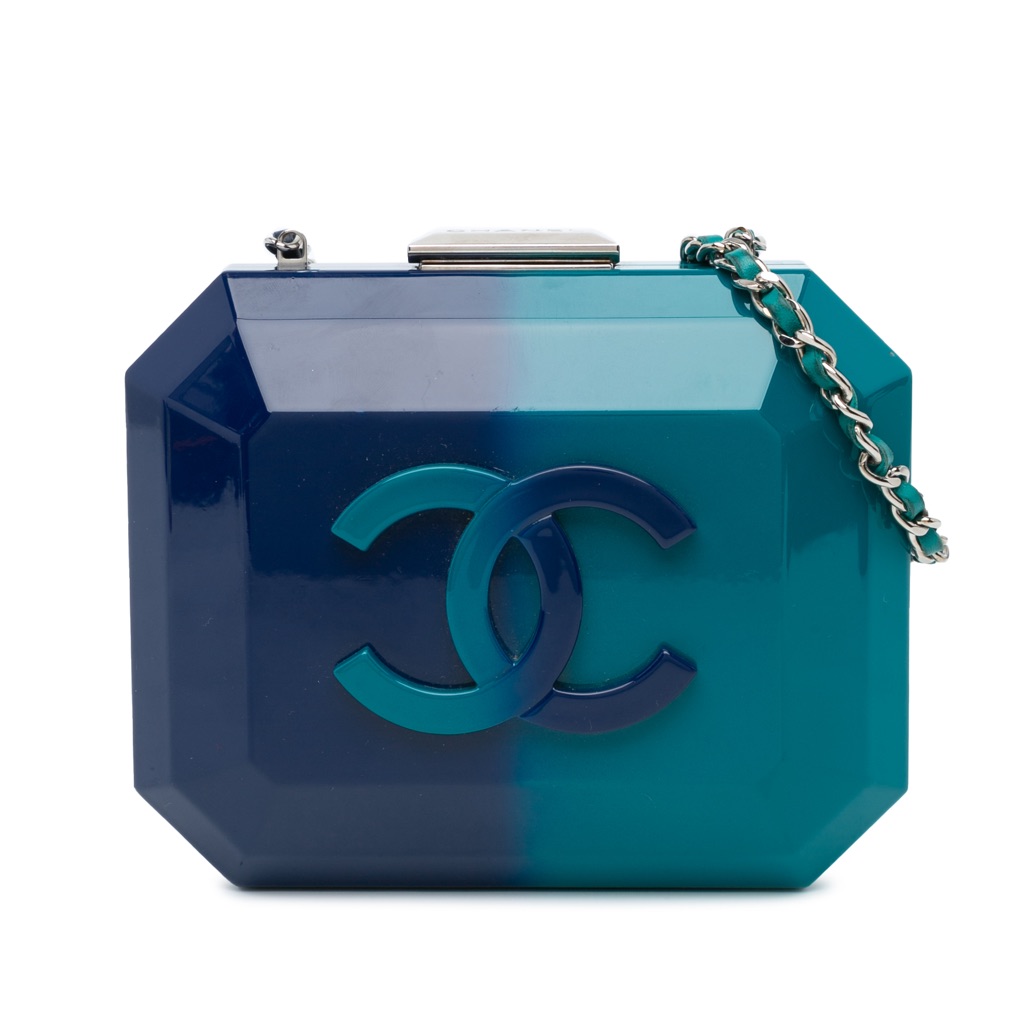 The Minaudiere features a plexiglass body, a leather woven chain strap, and snap closure.