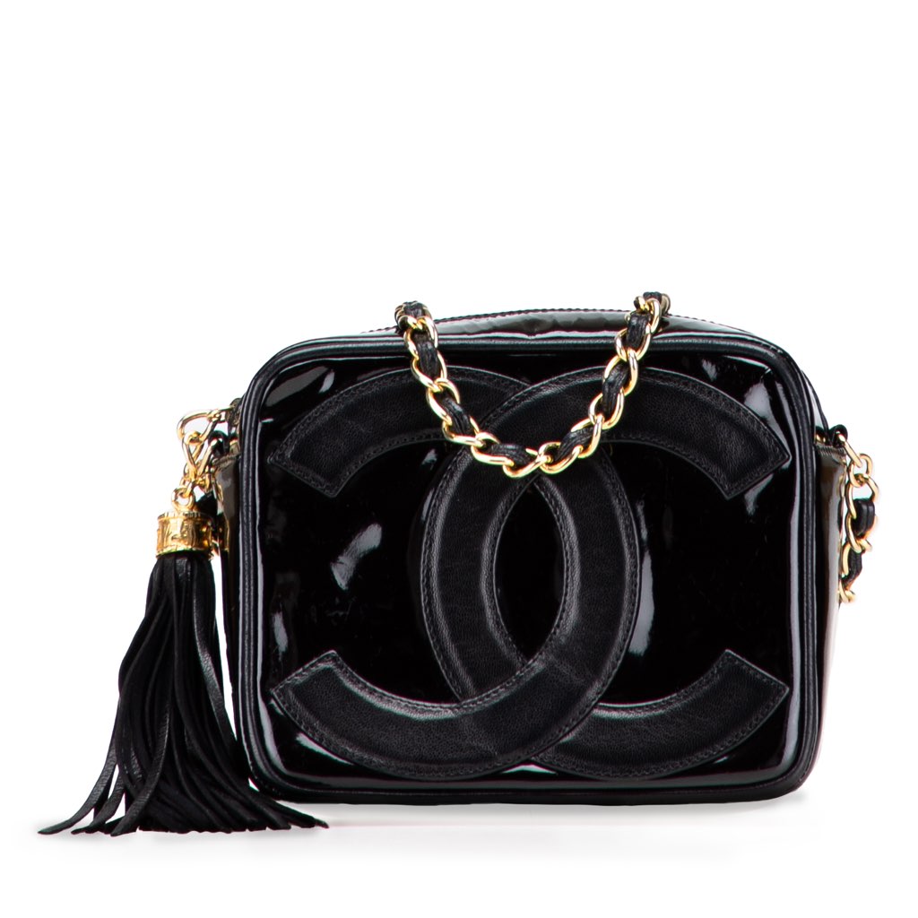 This crossbody bag features a patent leather body, a chain strap with tassel detail, top zip closure, and an interior zip pocket.