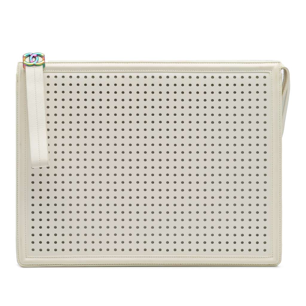 This clutch features a calf leather body, a top zip closure with flat leather wristlet zipper pull, and interior zip and slip pockets.