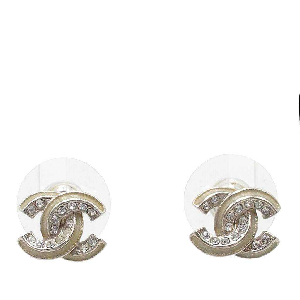 Chanel CC Plated Brass Strass Push Back Earrings Silver Bras