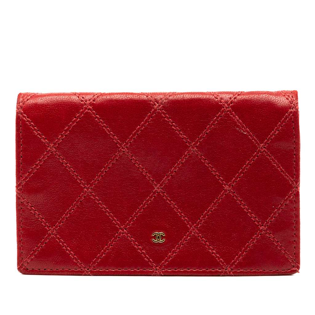 This small wallet features a quilted calfskin body, a bifold with snap button closure, and interior slip and flap pockets.