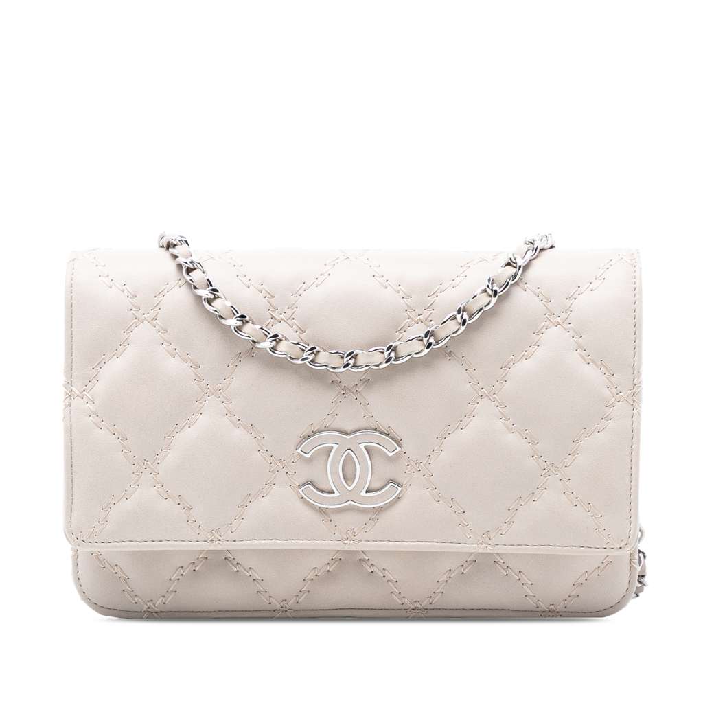 This wallet on chain features a quilted leather body, a leather woven chain strap, a top flap with a magnetic closure, and interior zip and slip pockets.