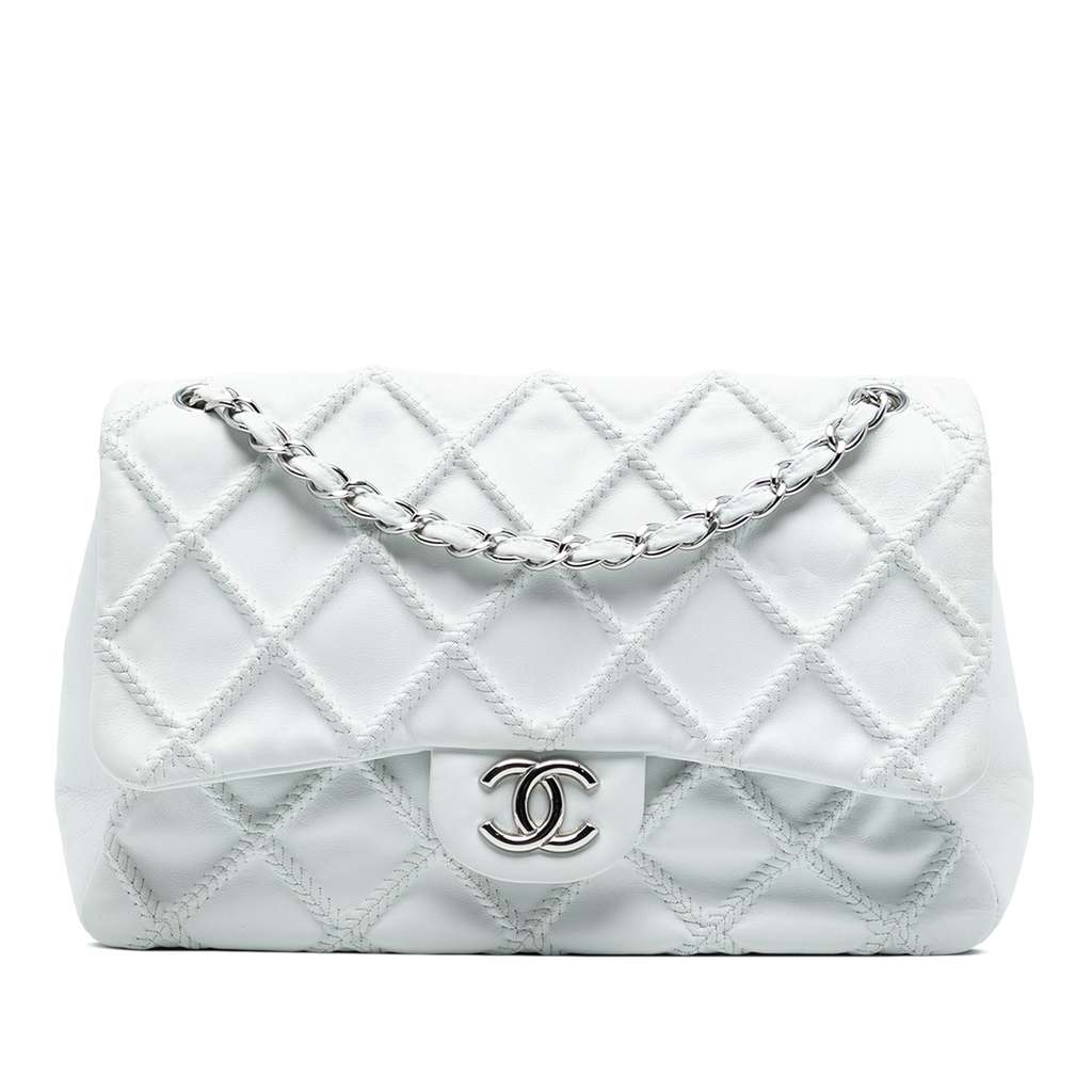 This shoulder bag features a quilted leather body, leather-woven chain link strap, front flap with turn lock closure, and interior zip and slip pockets.