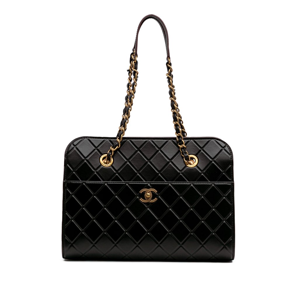 This tote bag features an embossed leather body, curb leather-woven chain straps with leather guard, an open top, an exterior front slip pocket with CC turn lock closure, and an interior zip pocket.