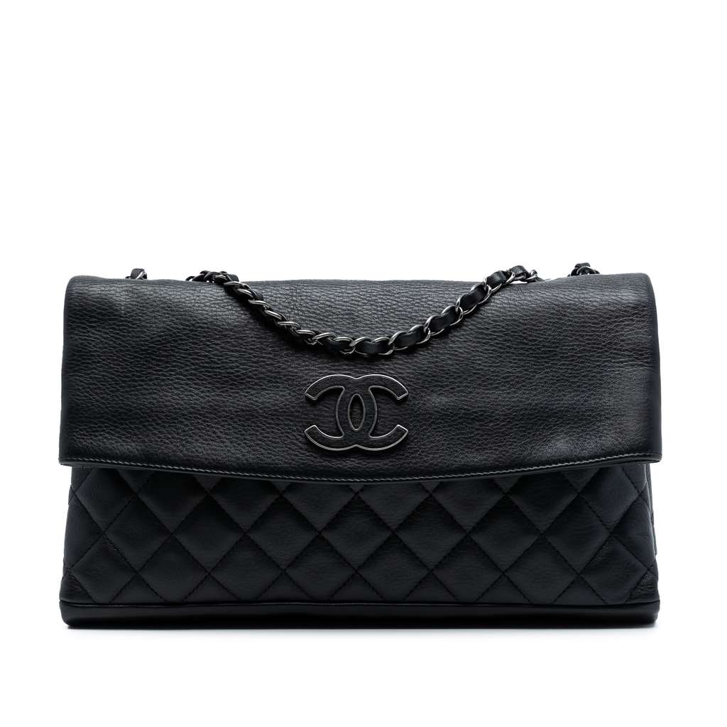 This shoulder bag features a quilted calf leather body, a silver-tone woven leather chain link strap, and a front flap with snap closure and an interior zip pocket.