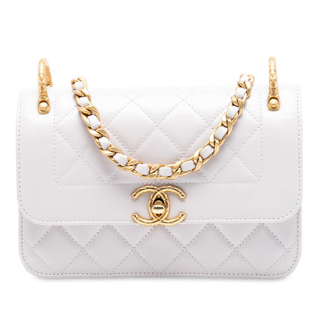 This crossbody bag features a quilted leather body, a leather woven chain-link strap with leather guard, a front flap with turnlock closure, and an interior slip pocket.