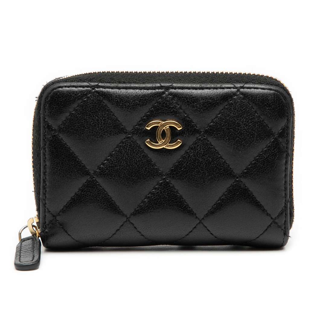 This coin purse features a quilted leather body, an exterior back slip compartment, and a zip-around closure.