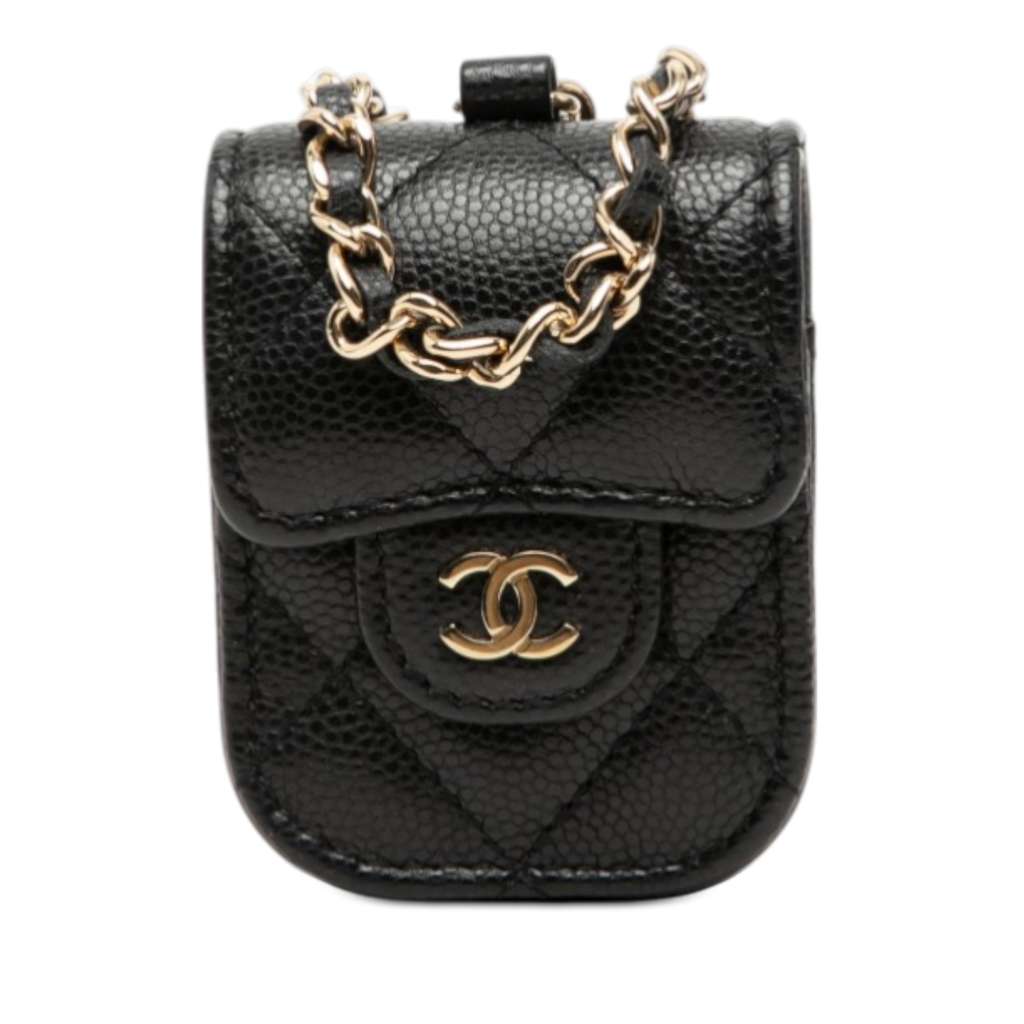 Chanel CC Quilted Caviar AirPods Case Black Leather
