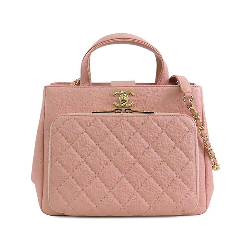 The Business Affinity satchel features a caviar leather body, flat leather handles, a leather woven chain link strap with leather shoulder guard, a top strap with twist lock closure, an exterior front zip pocket, an exterior back slip pocket, and interior zip and slip pockets.