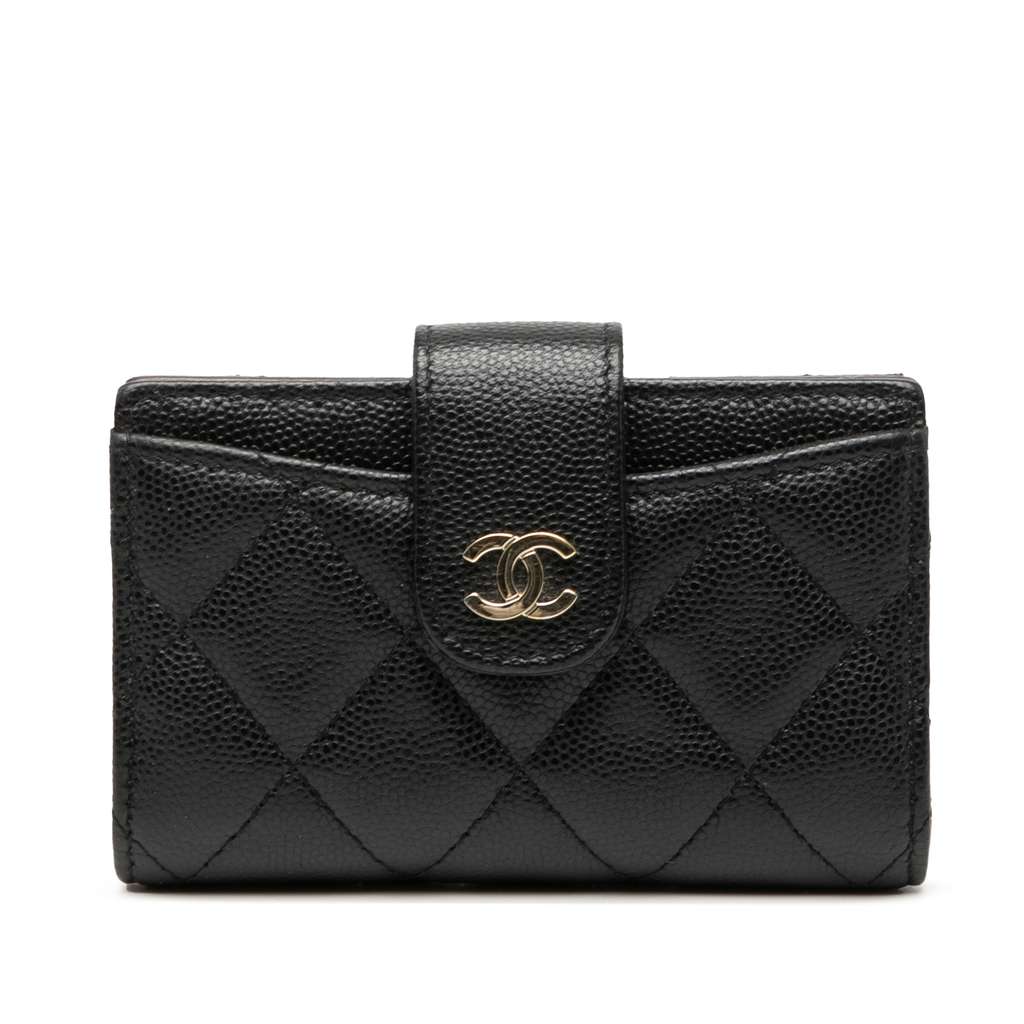 This card holder features a quilted caviar leather body, a top strap with snap closure, exterior slip pocket, and interior zip and slip pockets.