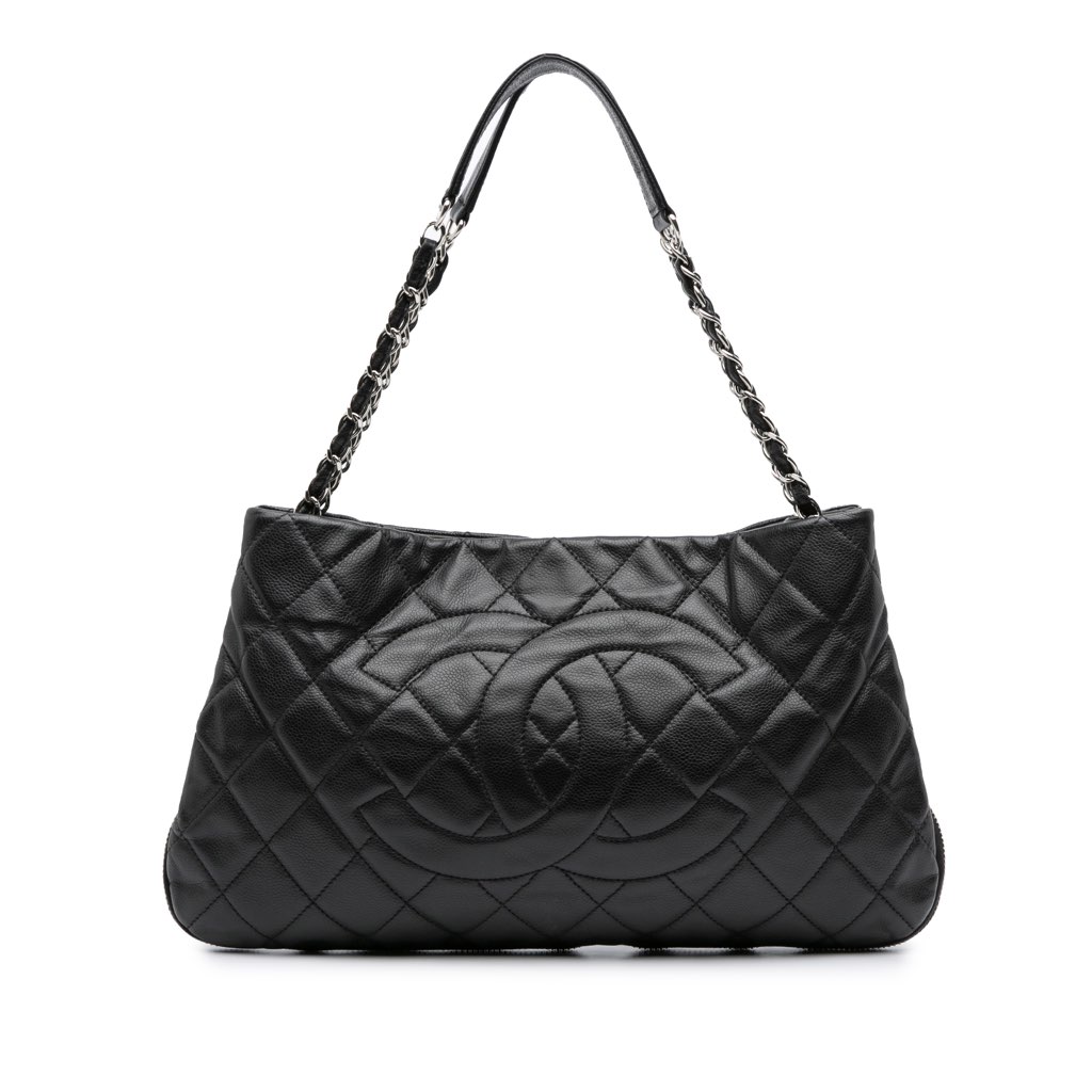 This tote bag features a quilted caviar leather body, curb chain straps with flat leather shoulder guards, an open top with magnetic snap closure, and interior zip and slip pockets.