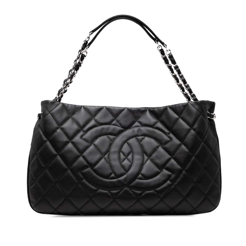 This tote bag features a quilted caviar leather body, a silver-tone curb chain link shoulder straps with leather guard, an open top with magnetic snap closure, and interior zip and slip pockets.