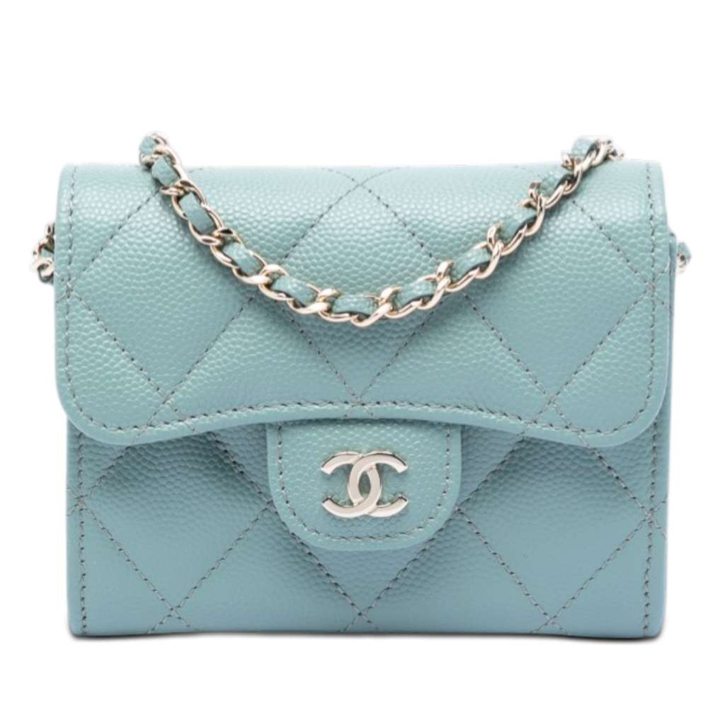 Chanel CC Quilted Caviar Flap Card Holder On Chain Blue Mini