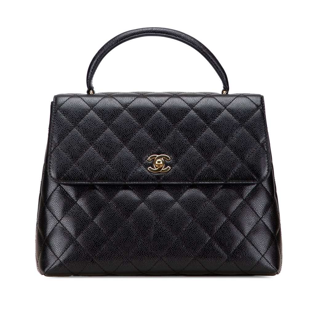 The Kelly features a caviar leather body, rolled top handle, a top flap with CC turn lock closure, an exterior slip pocket, and interior zip and slip pockets.