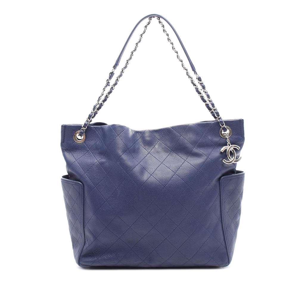 This tote bag features a quilted caviar leather body, a leather-woven chain and leather strap, an open top with snap closure, exterior side slip pockets, and interior zip and slip pockets.