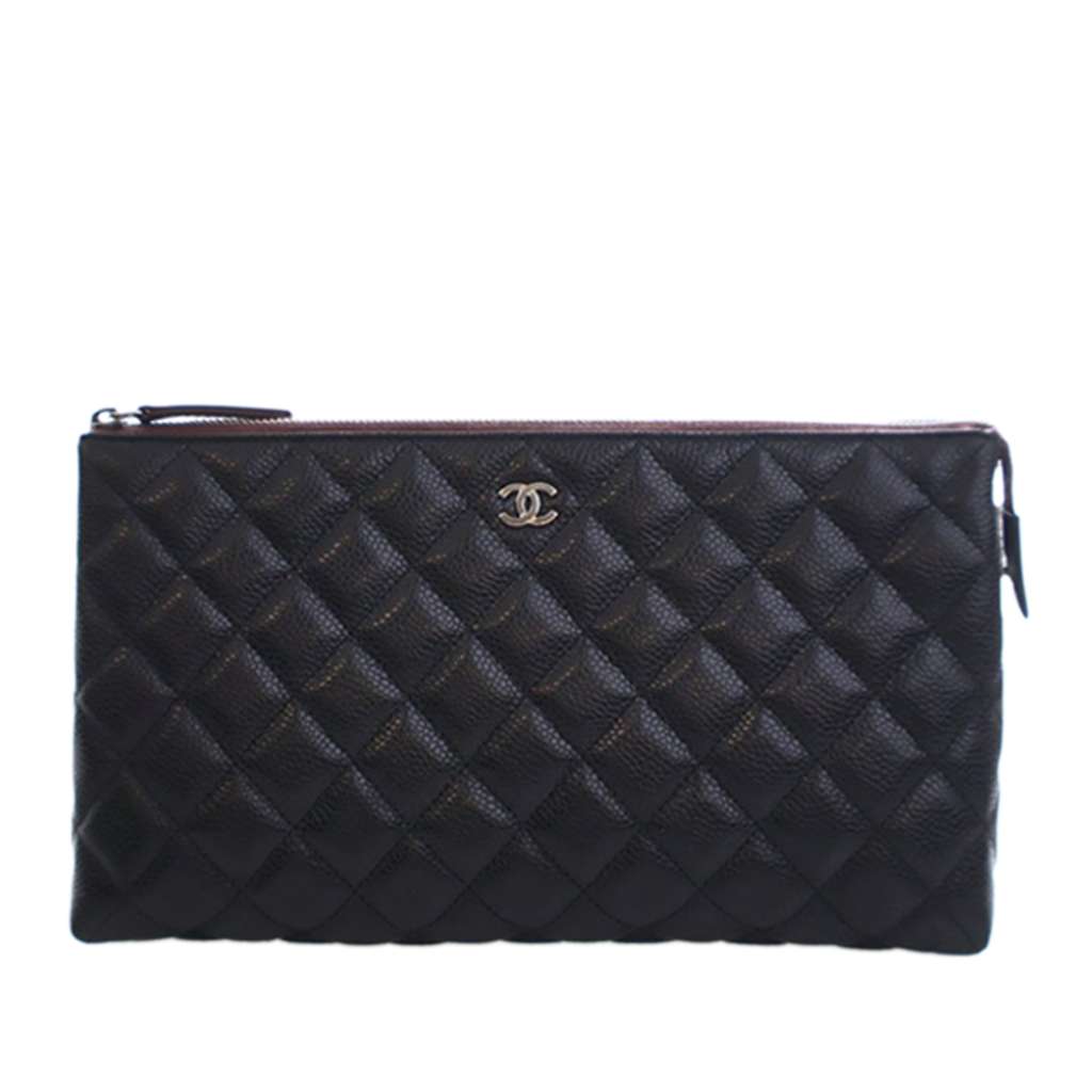 This pouch features a caviar leather body, a top zip closure, and interior slip pockets.